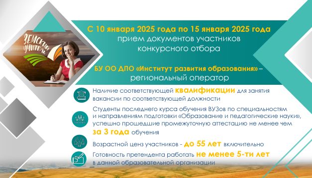 Уже известно, что в период с 10 по 15 января 2025 года пройдет прием документов участников конкурсного отбора, который организует Институт развития образования. Он является региональным оператором программы «Земский учитель». Принять участие в отборе могут и студенты последнего курса обучения вузов по специальностям и направлениям подготовки «Образование и педагогические науки», успешно прошедшие промежуточную аттестацию не менее чем за 3 года обучения. Возрастной ценз участников – до 55 лет включительно. Обязательна готовность претендента работать не менее 5 лет.
