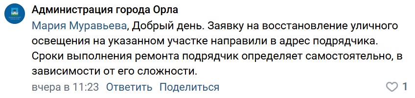 «Заявку на восстановление уличного освещения на указанном участке направили в адрес подрядчика. Сроки выполнения ремонта подрядчик определяет самостоятельно, в зависимости от его сложности», – гласит ответ.