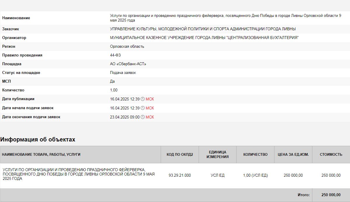 Управление культуры, молодежной политики и спорта администрации города Ливны выступило заказчиком в рамках проводимого тендера на оказание услуг по организации и проведению праздничного фейерверка. Согласно условиям тендера, это должен быть салют, посвященный Дню Победы в Великой Отечественной войне. Его следует провести в городе Ливны 9 мая 2025 года. Салют будет оплачен за счет бюджета города. Начальная максимальная цена контракта установлена в размере 250 тысяч рублей.