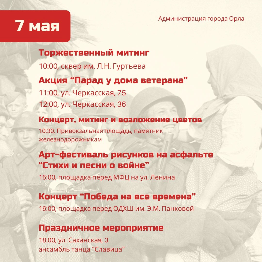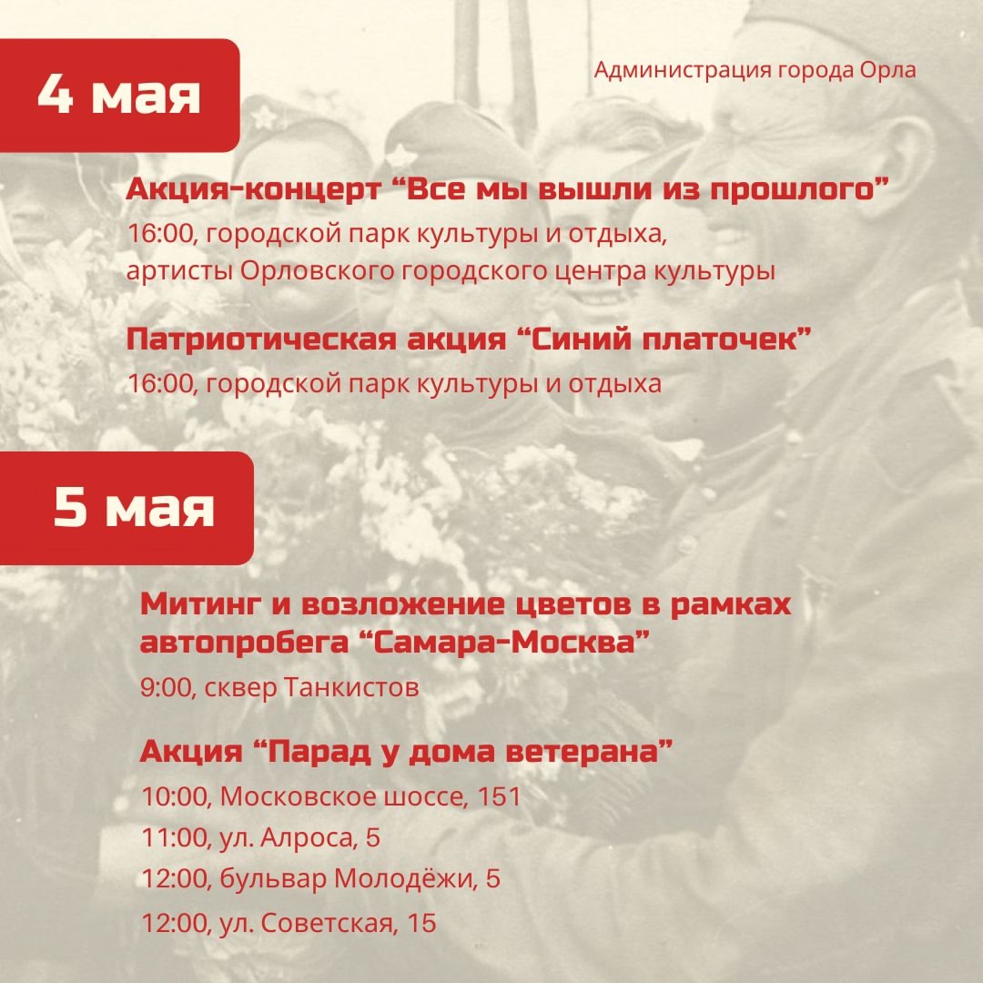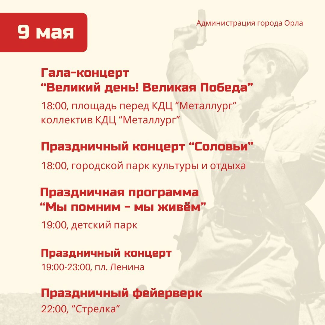 Мероприятия в честь Дня Победы будут идти до 9 мая включительно. Основная часть запланирована непосредственно на день праздника. В своих официальных соцсетях полную программу опубликовал мэр Орла Юрий Парахин.