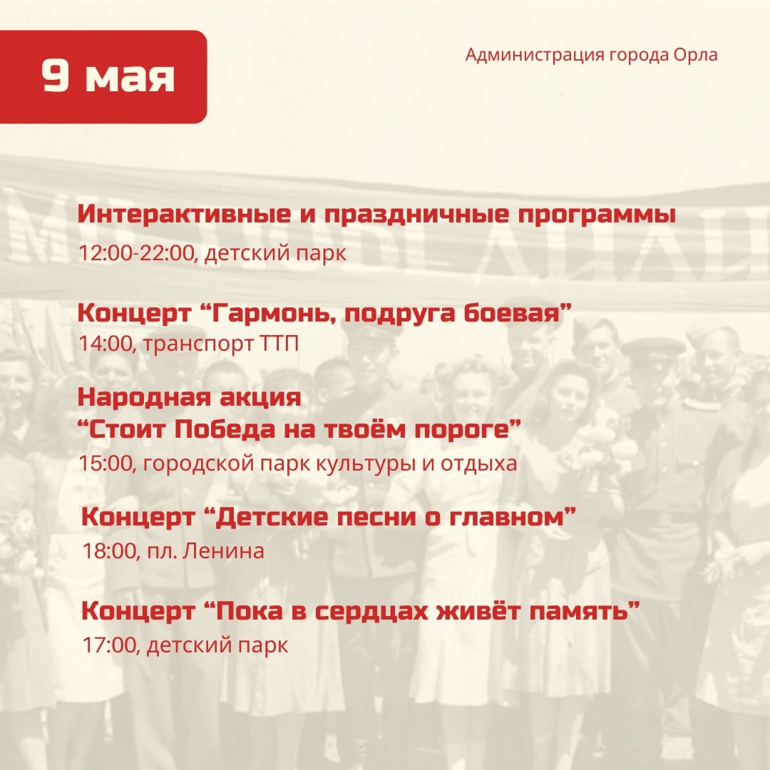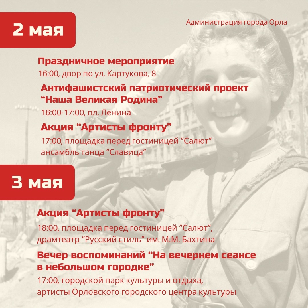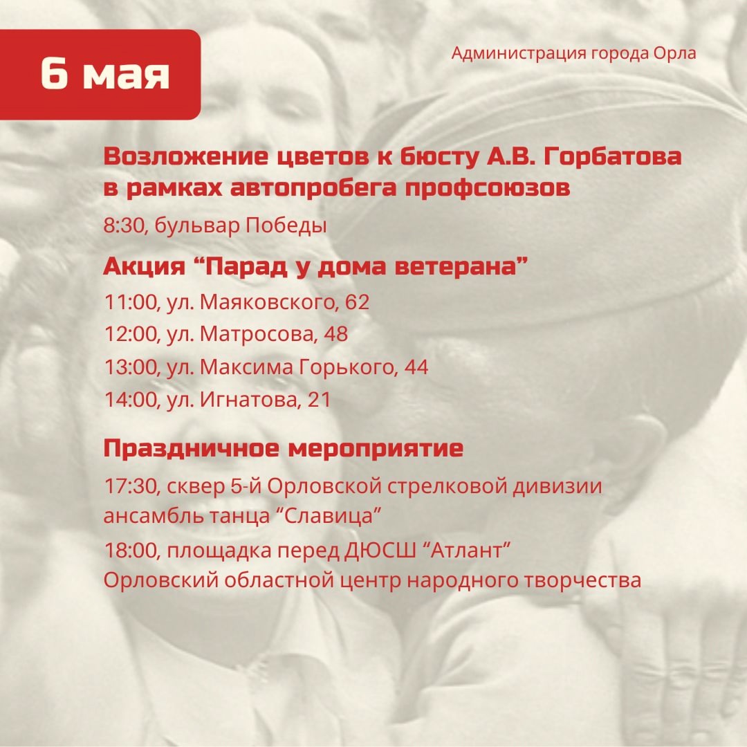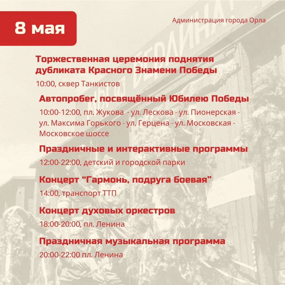 Мероприятия в честь Дня Победы будут идти до 9 мая включительно. Основная часть запланирована непосредственно на день праздника. В своих официальных соцсетях полную программу опубликовал мэр Орла Юрий Парахин.