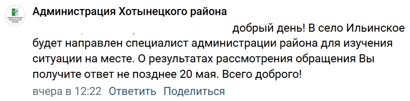 «В село Ильинское будет направлен специалист для изучения ситуации на месте. О результатах рассмотрения обращения Вы получите ответ не позднее 20 мая», – высказались представители властей.
