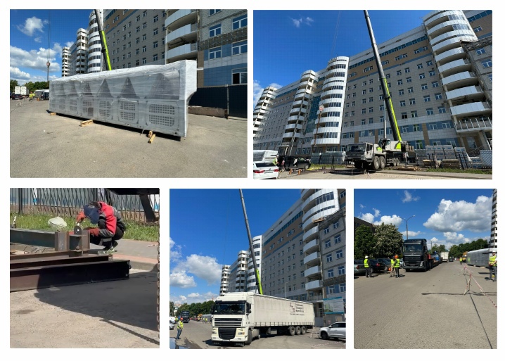 Работы выполняют сотрудники подрядной организации — ООО «Стрела». Известно, что на объекте работает башенный кран, способный поднять до 160 тонн. Именно его используют для подъёма оставшихся чиллер-фанкойла (на высоту в 44 метра).
