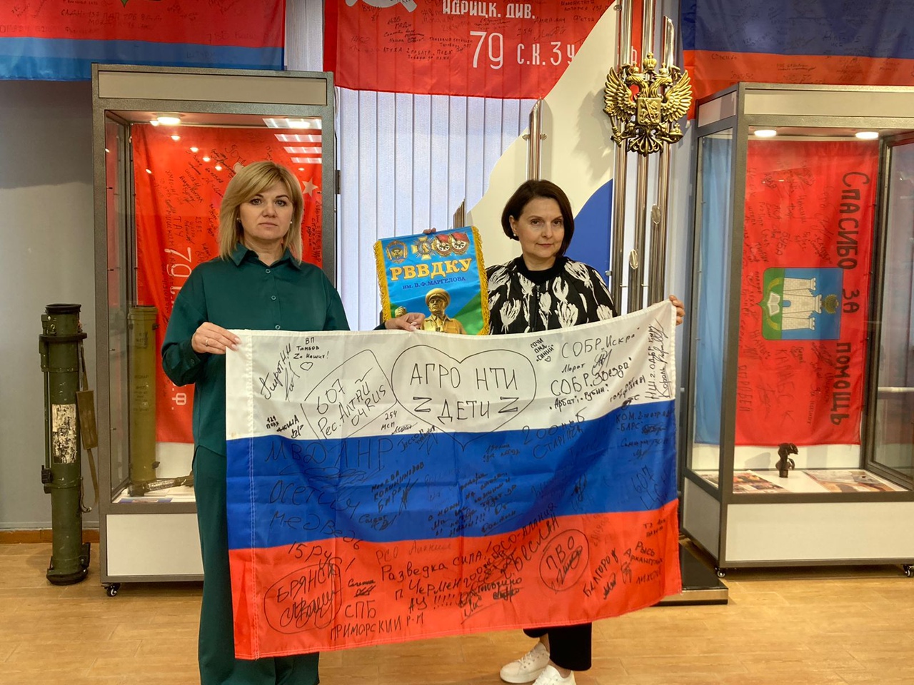 Знамёна передал губернатор Андрей Клычков. При этом на них расписались защитники Отечества, которые сейчас находятся на передовой.
