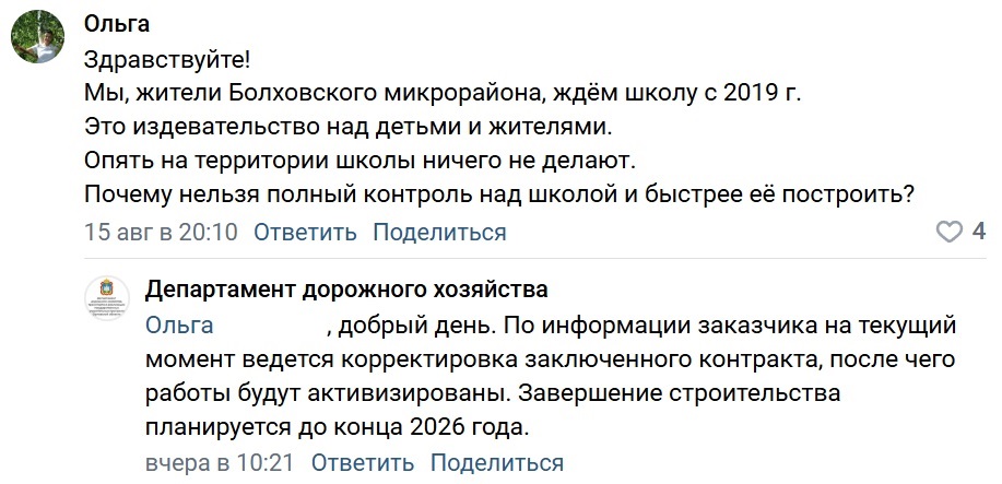 В департаменте, сославшись на заказчика, пояснили, что «на текущий момент ведётся корректировка заключённого контракта». После этого работы по строительству школы в Болховском микрорайоне (в деревне Жилина) должны будут активизироваться.