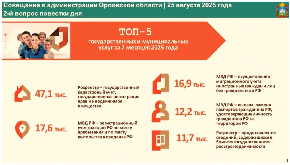 Павел Калугин выступил на совещании в администрации региона 25 августа. За семь месяцев текущего года в МФЦ Орловской области по принципу одного окна было представлено более 157 тысяч государственных и муниципальных услуг.
