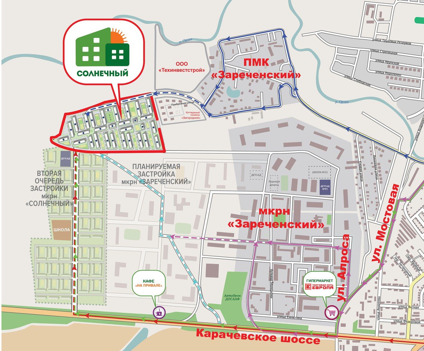 Изначально продажа квартир в “Солнечном” проходила от застройщика Fedeco (Федеральная девелоперская компания). После возведения двух зданий весной 2016 года в рамках партнёрского соглашения появился застройщик ООО «Компания Стройсервис». Рекламировался формат микрорайона – трёхэтажные многоквартирные дома из кирпича и панельных плит. Всего их должно было быть 135. Уголовное дело об обмане дольщиков было возбуждено летом 2019 года. ООО «Компания Стройсервис» признано банкротом.