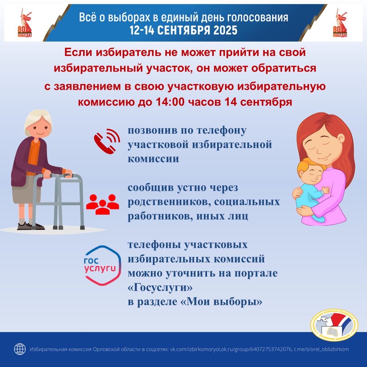 Новый состав представительного органа формируется 12, 13 и 14 сентября. Если вы не можете посетить свой избирательный участок, доступны следующие варианты подачи заявления на голосование на дому: письменное обращение, телефонный звонок, передача заявления через родственников, соседей или социальных работников. Крайний срок – 14:00 14 сентября. Уточнить информацию можно по телефону УИК или «Горячей линии» Избирательной комиссии Орловской области (486-2) 76-22-09.