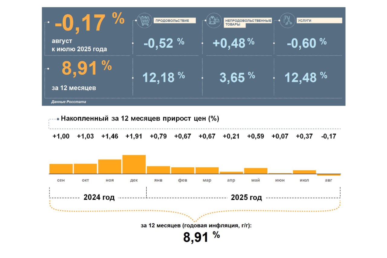 Цены в Орловской области в августе 2025 года, по данным Росстата, снизились на 0,17 процента по отношению к июлю. Годовая инфляция замедляется третий месяц подряд, отмечают аналитики. В августе она составила 8,91 процента, правда, это выше, чем в целом по стране (8,14 процента). Сообщается также, что в августе цены на продовольствие и услуги в регионе снизились, но накопленным итогом за 12 месяцев выросли больше, чем вся потребительская корзина.