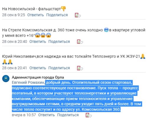 Тем временем потребители жалуются на холод в квартирах мэру Орла в социальных сетях. Как пояснили им с официального аккаунта мэрии, «пуск тепла – процесс поэтапный… в среднем уходит пять дней и более».