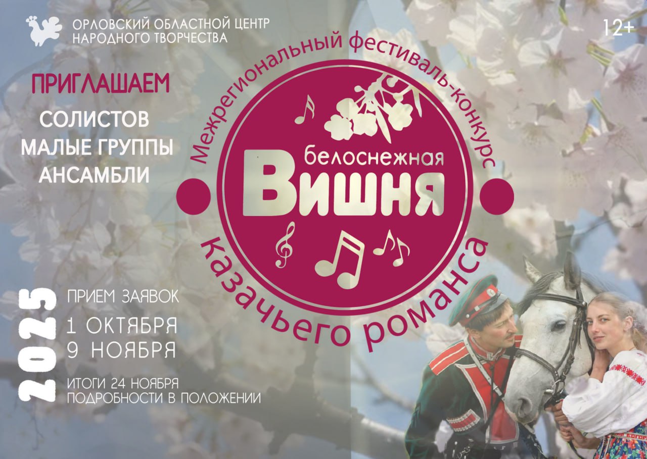 Орловский областной центр народного творчества пригласил всех желающих принять участие в открытом конкурсе казачьего романса «Вишня белоснежная». Прием заявок стартовал 1 октября и продлится он по 9 ноября 2025 года включительно. Заявки принимаются в электронном формате путем заполнения специальной формы на сайте Центра. Итоги будут подведены к 14 ноября 2025 гола, а рассылка дипломов продлится до 30 ноября 2025 года. Отметим, что формат данного мероприятия – дистанционный, что значительно сэкономит время и деньги участникам.