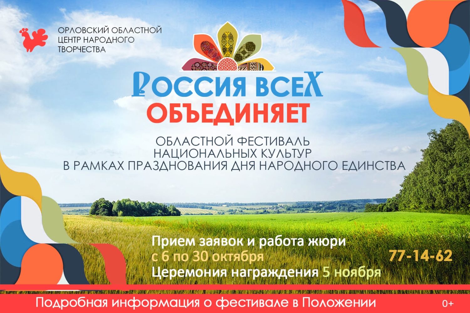 Областной дистанционный фестиваль национальных культур «Россия всех объединяет», посвященный Дню народного единства, стартовал в Орловской области. Прием заявок на участие продлится по 30 октября 2025 года. Участникам необходимо направить на электронную почту организаторов одним письмом заявку и ссылку на видеозапись конкурсного номера, размещенную на облачном хранилище. В период с 31 октября по 3 ноября 2025 года оргкомитет просмотрит и оценит присланные видеоматериалы. А 5 ноября состоится церемония награждения.