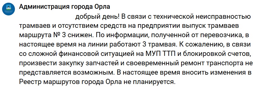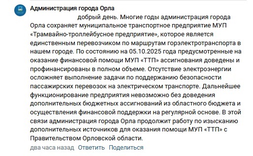 «Отсутствие электроэнергии осложняет выполнение задачи по поддержанию безопасности пассажирских перевозок на электрическом транспорте», – признали в комментарии, который разместили в соцсетях посредством официального аккаунта Администрации Орла.