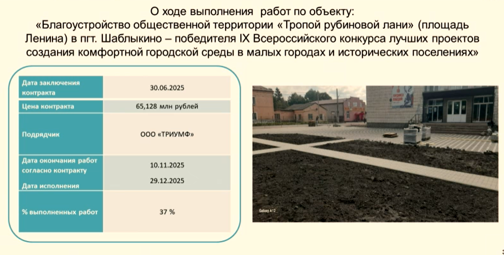 «В настоящее время в связи с неблагоприятными погодными условиями, повышением цен на услуги имеется риск невыполнения работ в установленный срок, – заявил Сергей Новиков. – В связи с чем подрядчик обратился с предложением об увеличении авансового платежа до 50%. 27 октября на очередной сессии Шаблыкинского районного поселкового совета было принято такое решение. Подрядчик ООО «Триумф» обязуется выполнить работы по контракту до конца ноября 2025 года».
