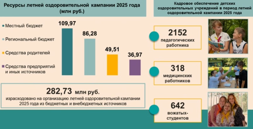 На организацию летней оздоровительной кампании 2025 года из бюджетных и внебюджетных источников израсходовано 282,73 миллиона рублей. Органами местного самоуправления проводится большая организационная работа и в целом сохранены показатели 2024 года по объему финансирования и количеству охвата детей.