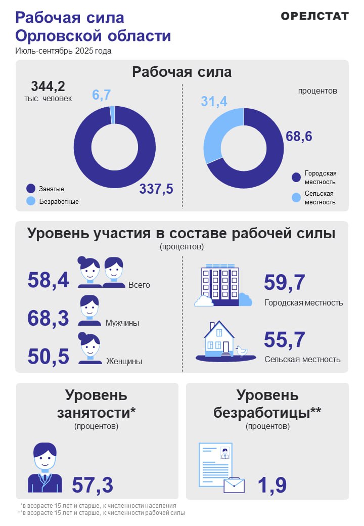 Орелстат обнародовал результаты выборочного обследования рабочей силы, проведенного за июль-сентябрь 2025 года. Сообщается, что численность рабочей силы, а это граждане в возрасте 15 лет и старше, в Орловской области составила 344,2 тысячи человек. Из них 337,5 тысячи орловцев классифицировались как занятые экономической деятельностью, а 6,7 тысячи орловцев – как безработные, соответствующие критериям Международной организации труда (МОТ).
