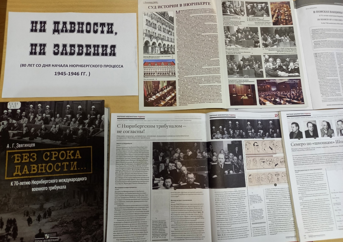 Сотрудники библиотеки рекомендуют посетителям выставки обратить внимание на книгу «Без срока давности», изданную в Москве к 70-летию Нюрнбергского процесса. Ценность данного издания заключается в том, что ее автор использовал редкие архивные документы, ему удалось поработать с малодоступными источниками. В книге приводятся результаты последних исследованиях и воспоминания непосредственных участников тех далеких событий.