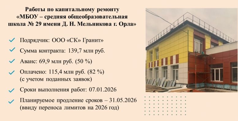 О ходе капремонта в образовательных учреждениях Орла мэр Юрий Парахин рассказал на совещании в администрации региона 8 декабря. Здание школы №29 приводят в порядок за 139,7 миллиона рублей. Срок окончания работ, с учетом приостановки, – 7 января 2026 года. В настоящее время монтаж вентиляционного фасада выполнен на 80%, монтаж электропроводки – 75%, оштукатуривание стен – 95%, керамическая плитка уложена на 55%, линолеум – 15%, вентиляционные системы – 60%.