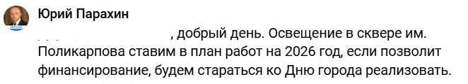 Ещё в одном случае орловцы посетовали на такие же проблемы в сквере имени Поликарпова. Здесь сроки оказались иными. Мэр указал, что выполнение данных работ запланировано на будущий год. При наличии нужных средств освещение сделают к 5-му августа.