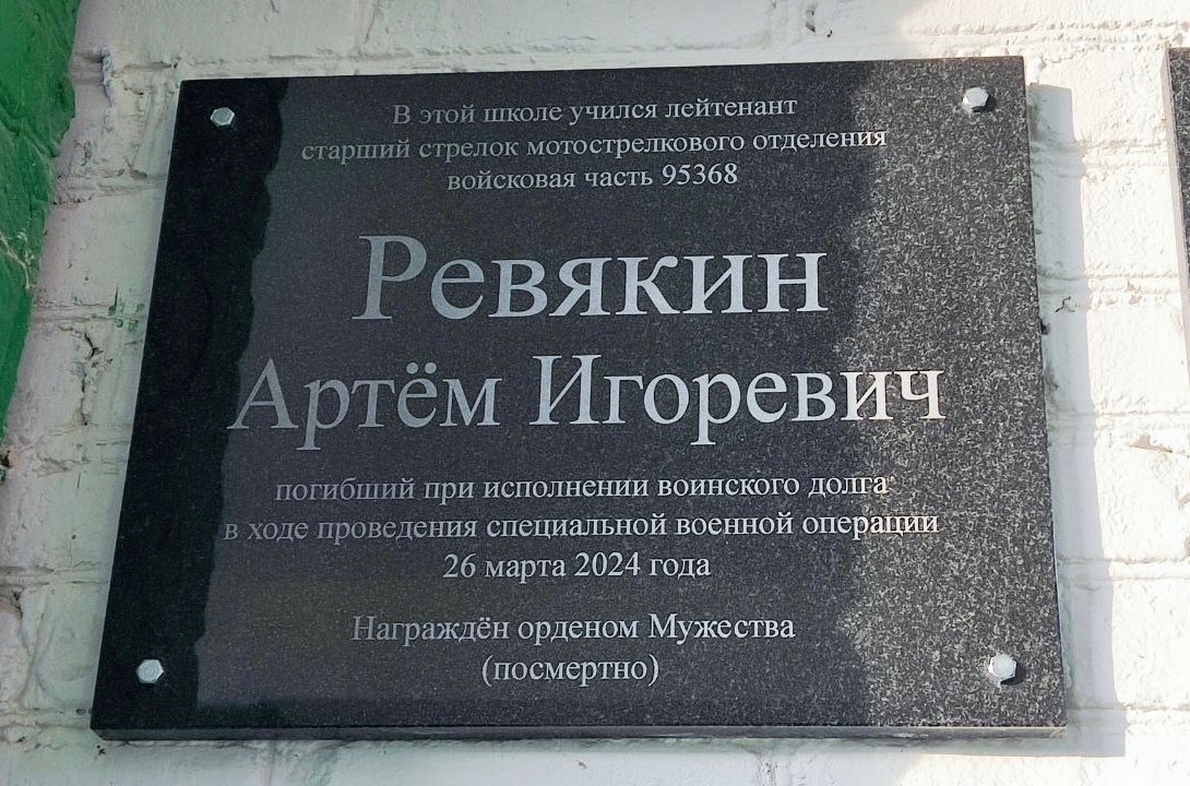 Так, на фасаде школы №2 установлен такой объект в память об Артёме Ревякине. Мужчина был старшим стрелком. Служил в звании лейтенанта. Ревякин погиб в 2024 году в марте.