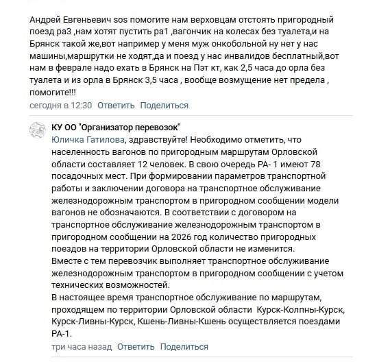 Жительница Верховского района опубликовала комментарий в соцсетях на официальной странице губернатора Орловской области. Орловчанка подняла тему пригородных поездов, соединяющих районный и областной центры, а также Орёл и Брянск.