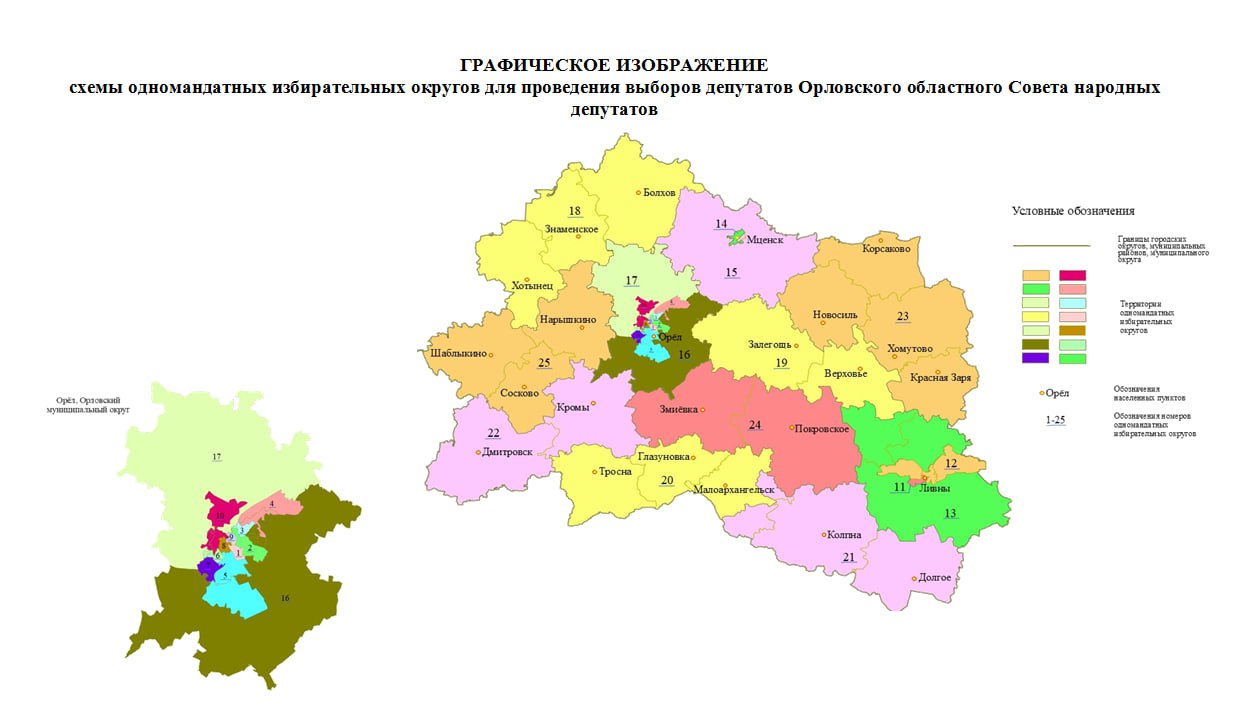 Например, одномандатный избирательный округ № 21 утвержден в границах Должанского, Колпнянского и Малоархангельского района, включая Луковский и Первомайский сельсоветы. Количество избирателей на его территории: 19 606 человек. А на территории одномандатного избирательного округа № 22 насчитывается 25 044 избирателя, он образован в границах Дмитровского и Кромского районов.