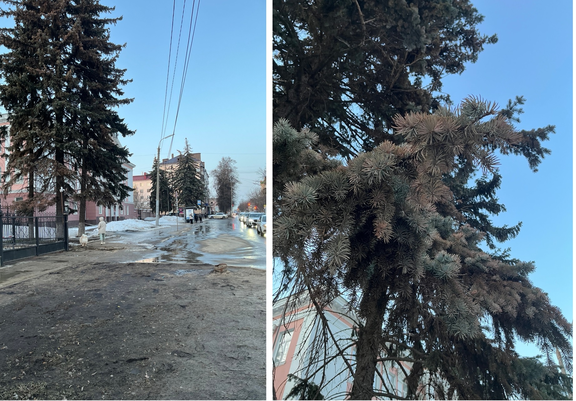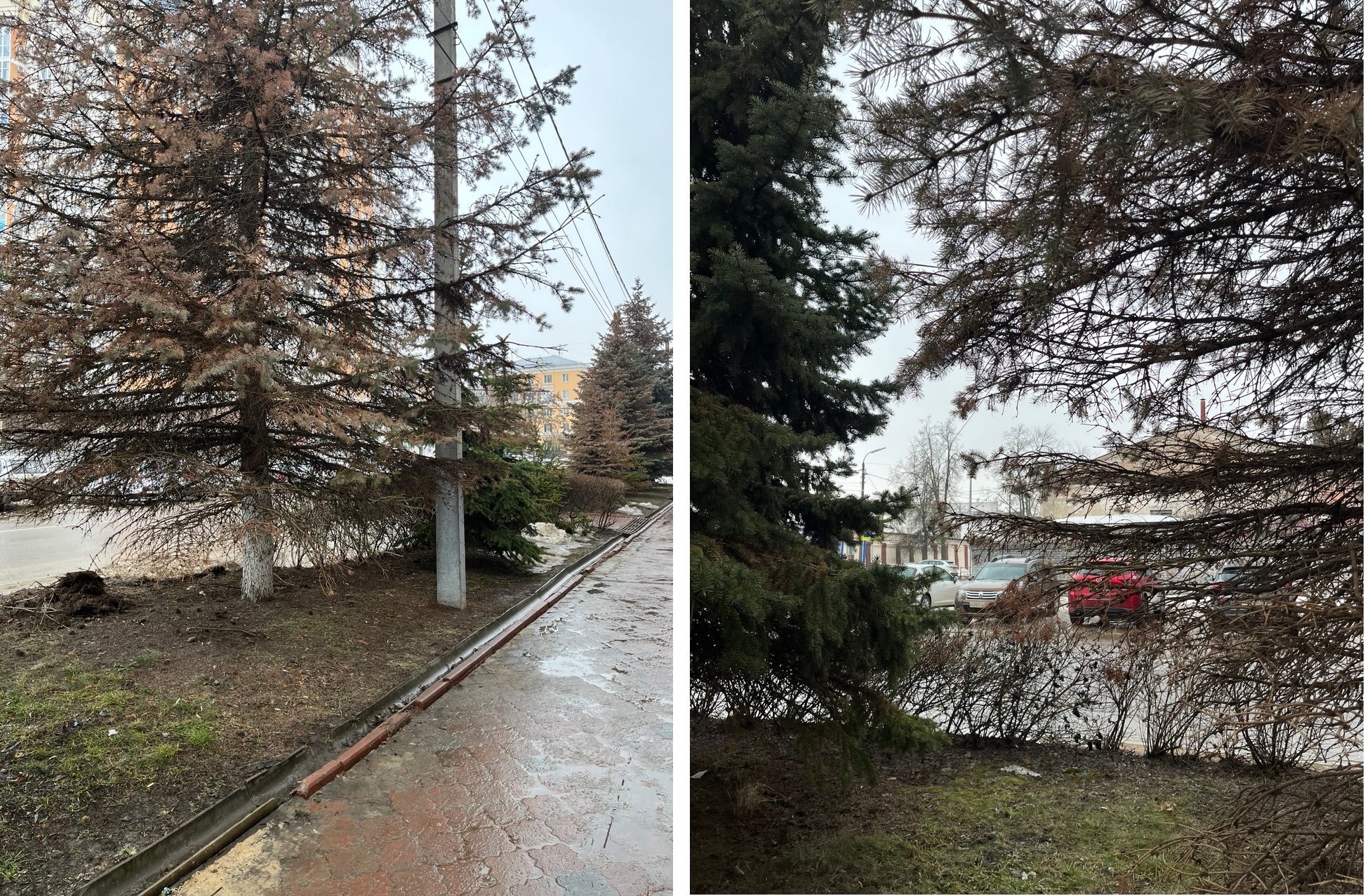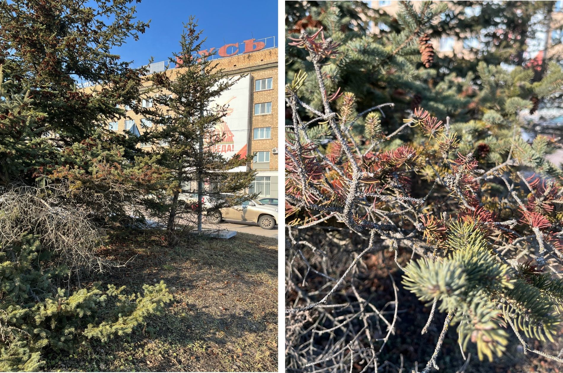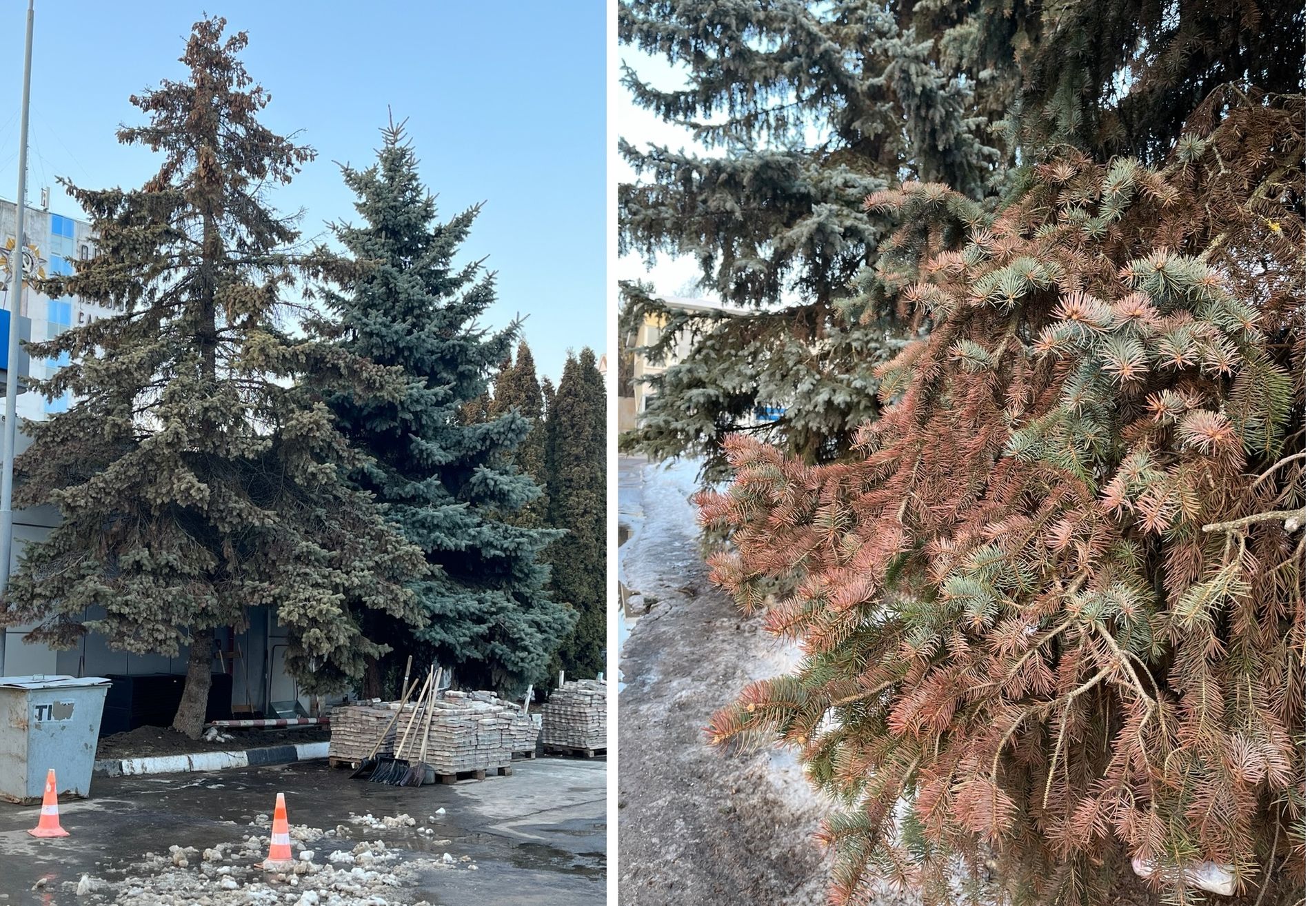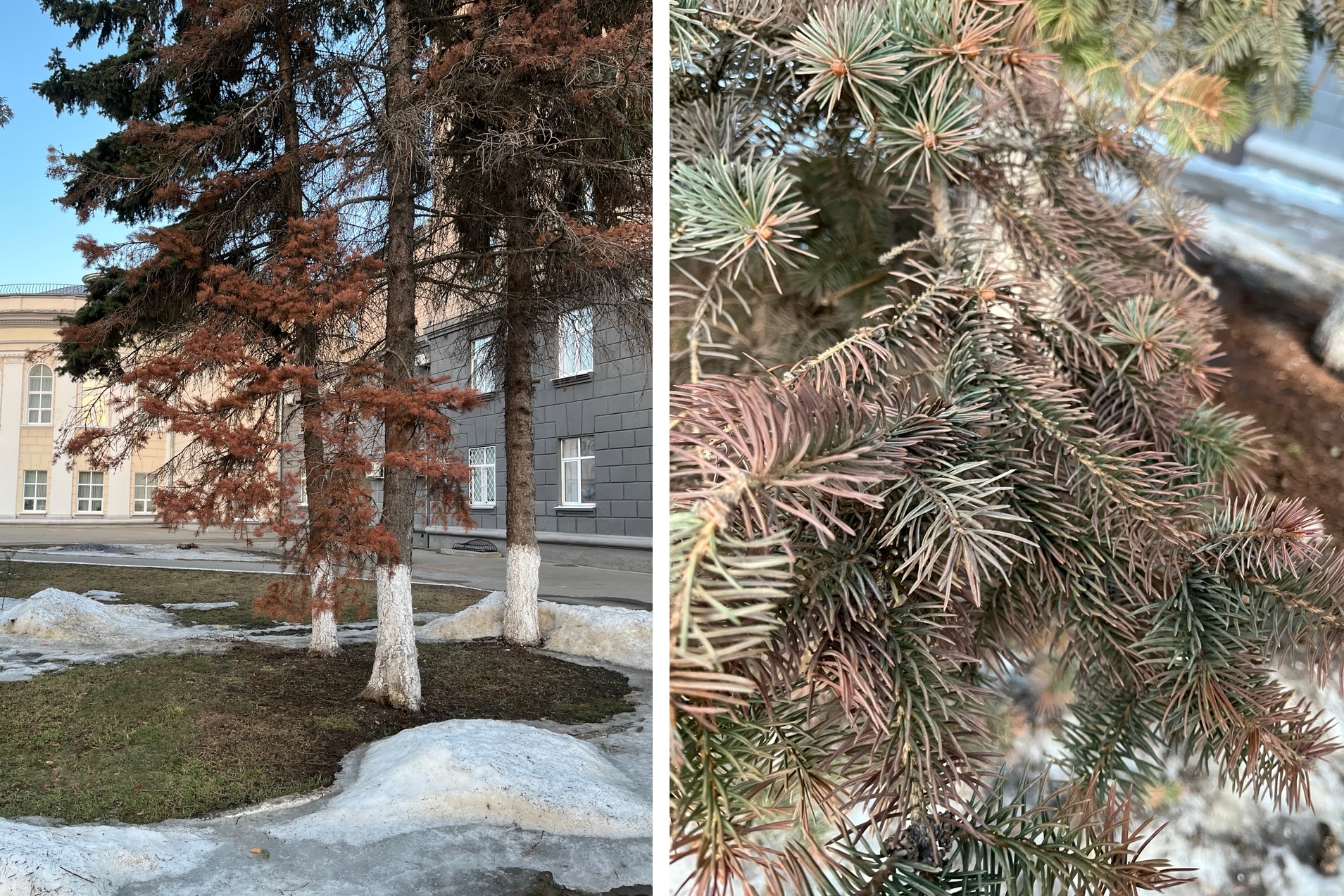 Зеленые и сизые красавицы теряют хвою и сохнут.