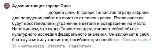 Ситуацию прояснил комментарий, оставленный с официального аккаунта Администрации Орла «ВКонтакте».
