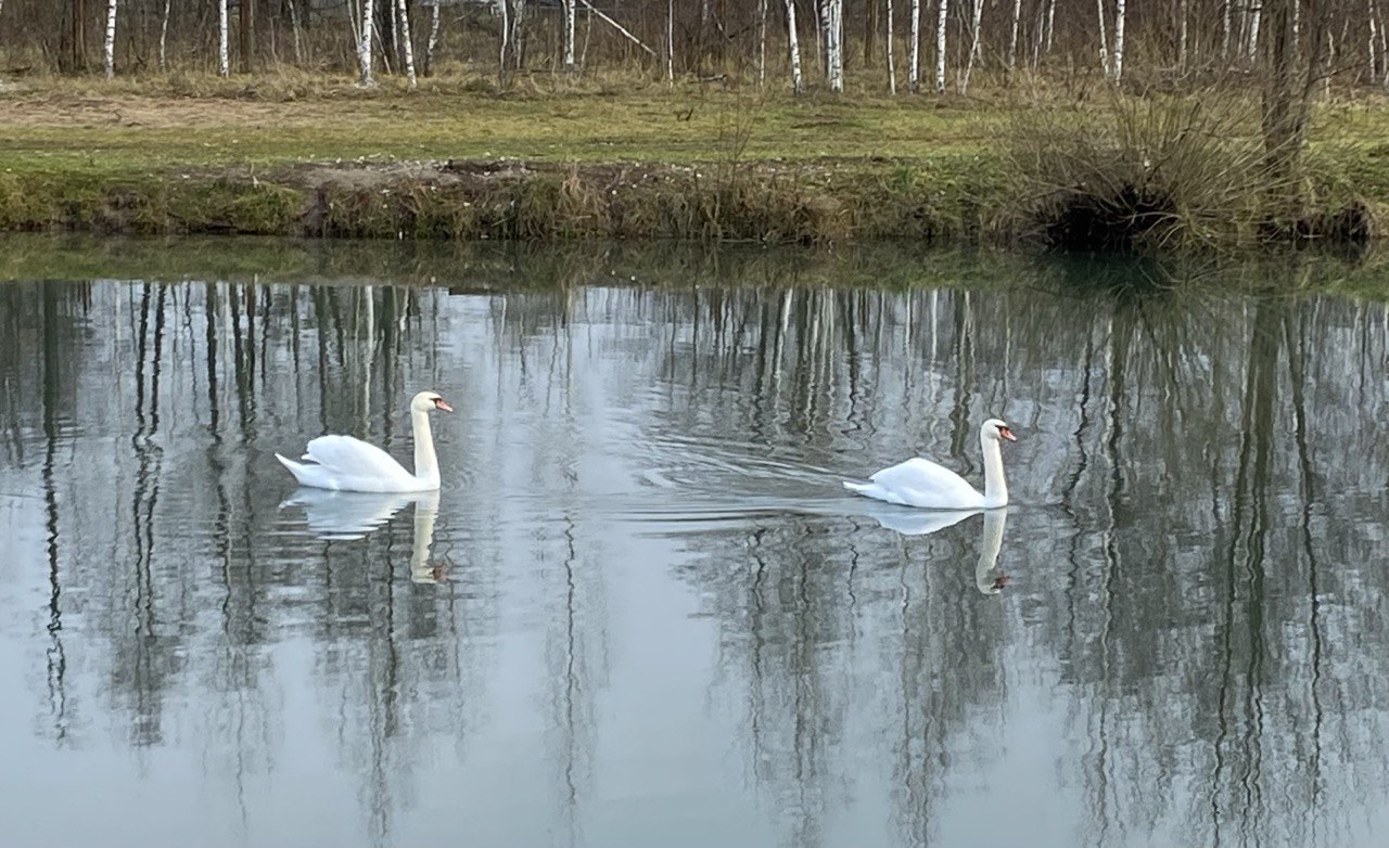 лебеди, река, птицы, лес
